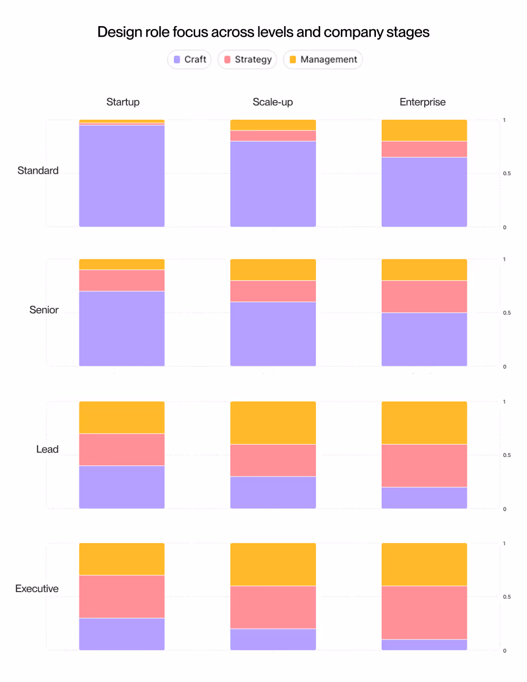 The chart makes it clear: the steepest shifts occur at the lead and executive levels. In startups, leads are still makers as much as managers. By the scale-up stage, management gets heavier — coaching, hiring, and building process take centre stage. In enterprises, leadership is less about making things and more about creating the conditions for others to succeed.